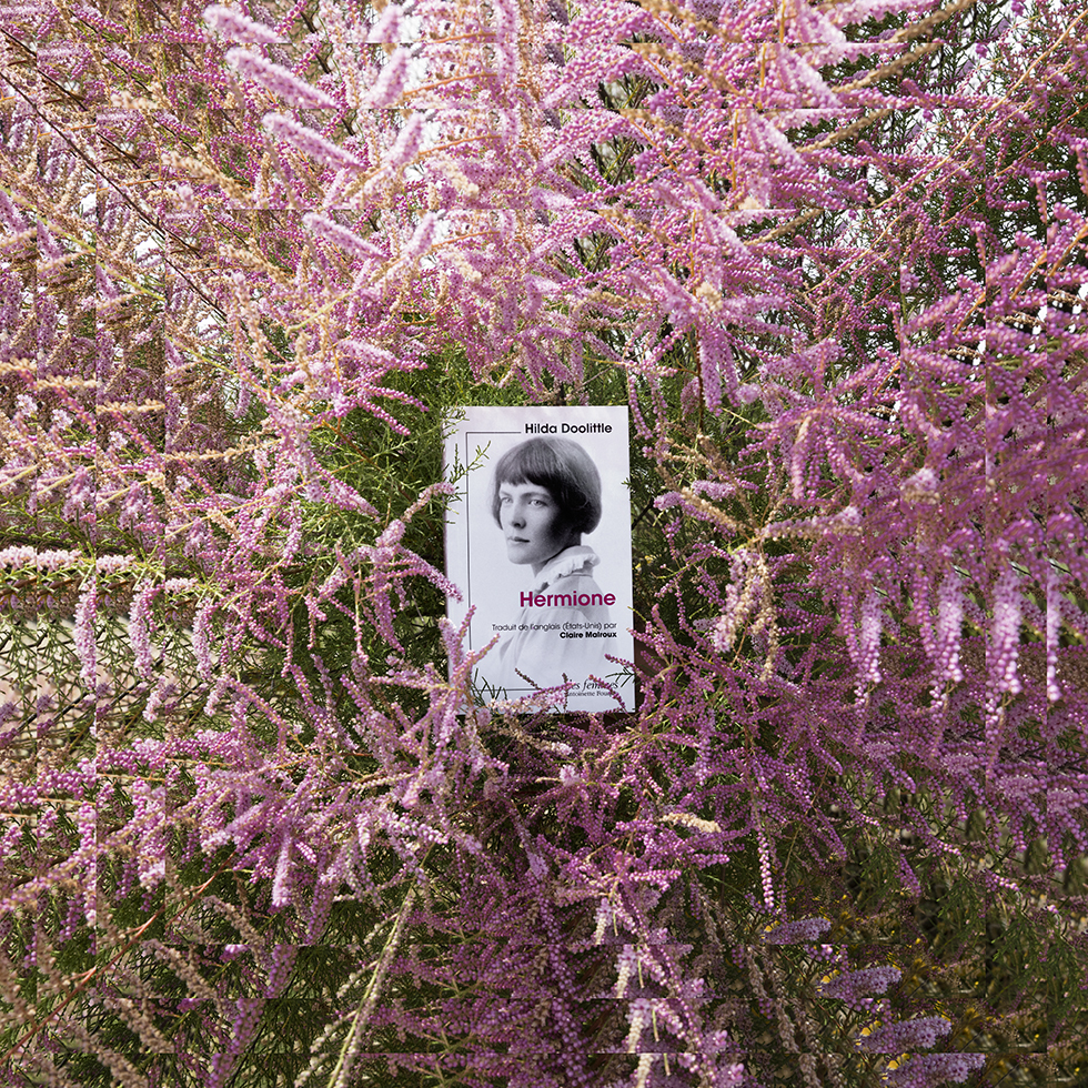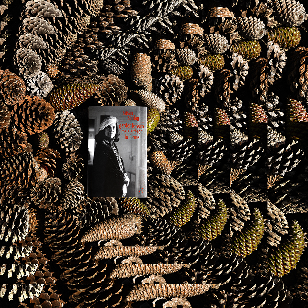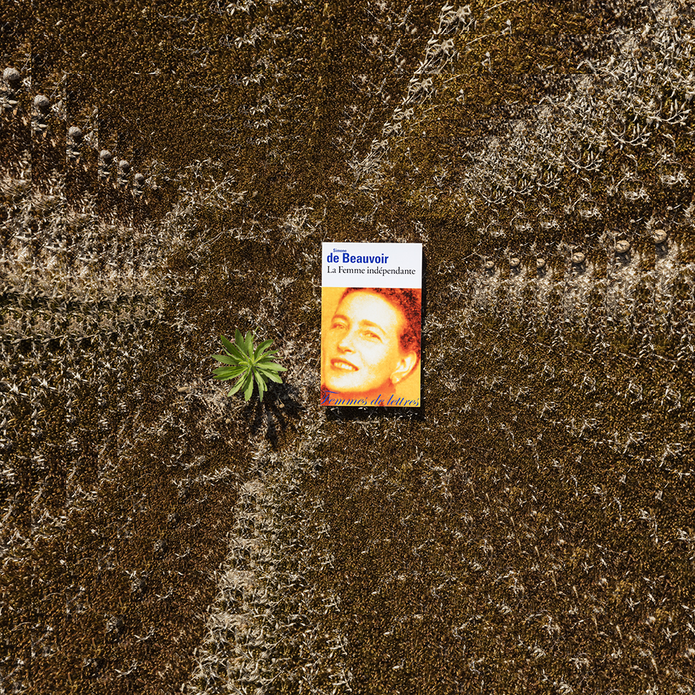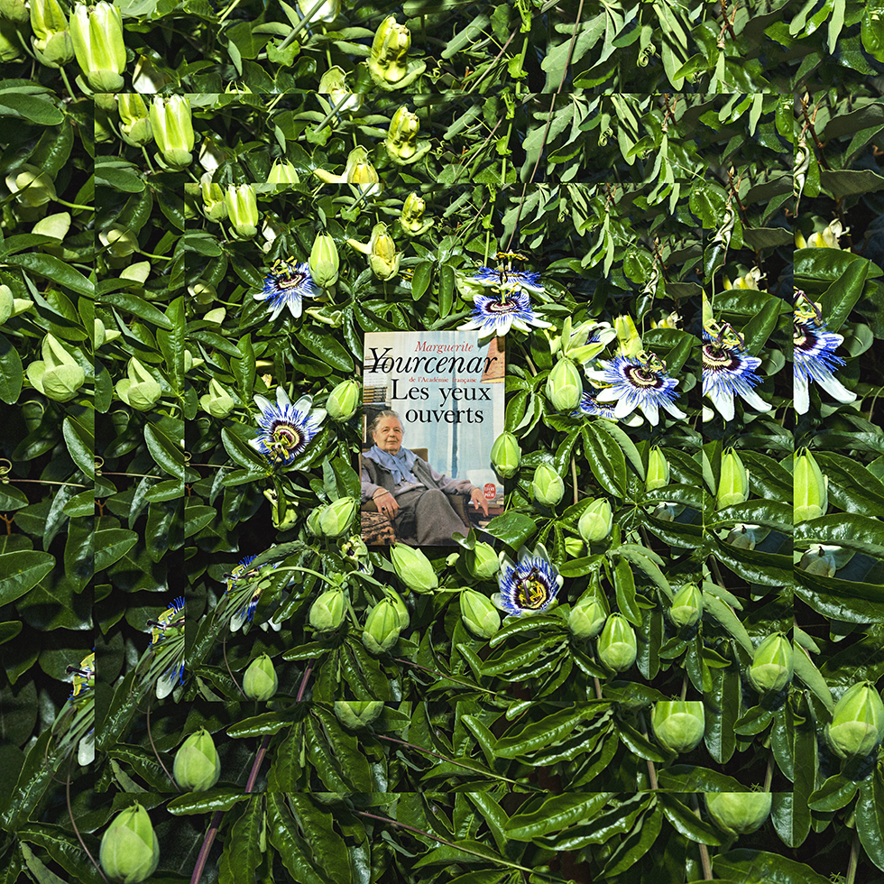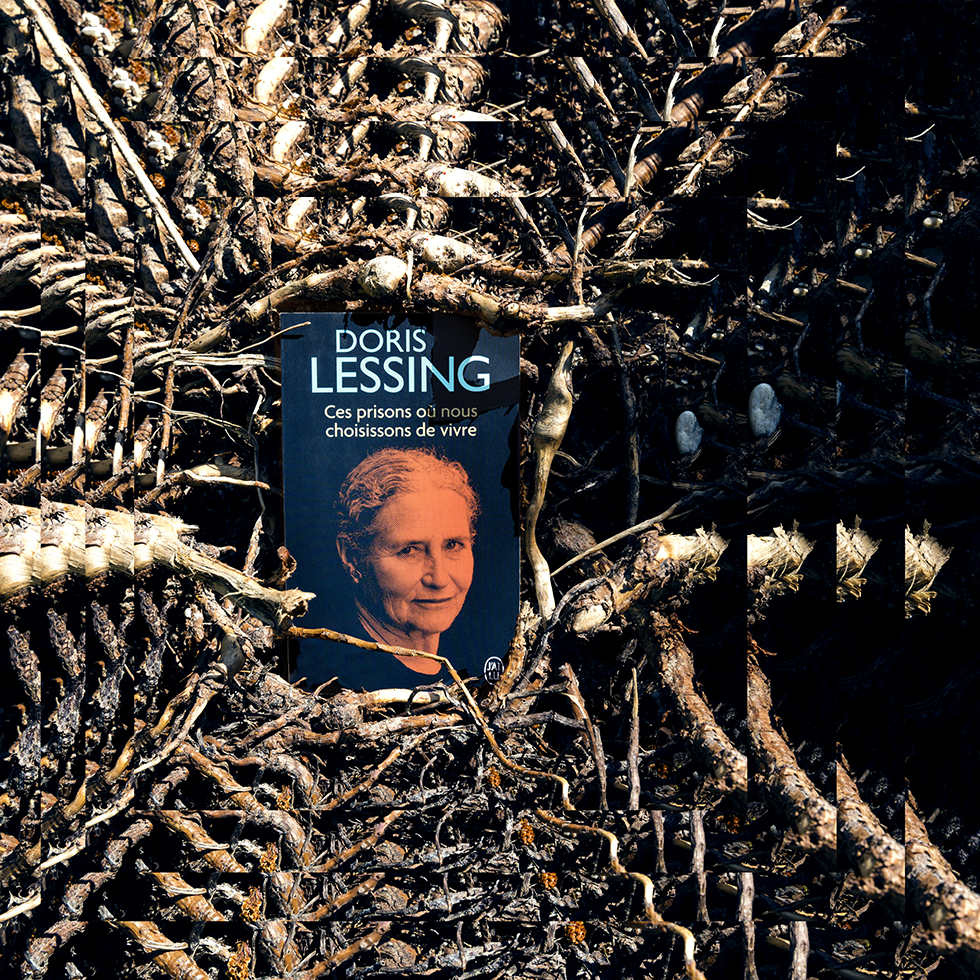 C’est de cette prise de conscience qu’est née la série Hineni – mot hébreu signifiant « Me voici ! ». Cette série se veut un geste d’insoumission face à l’invisibilité persistante faite aux femmes dans la sphère publique. Le titre porte leur combat, leur puissance créatrice et leur capacité à proposer une vision du monde singulière à travers leurs propres écrits. Mon travail a alors été de circonscrire vingt-trois créatrices pionnières et engagées – souvent au péril de leur vie – au cours du dernier siècle : essayistes, philosophes, poétesse ou artistes. Pour chacune, j’ai retenu une de leurs publications dont la couverture présente leur portrait. J’ai photographié leurs livres dans des environnements naturels en résonance avec leurs champs d’exploration et de réflexion. Puis, j’ai inscrit chaque photographie dans un montage de figures fractales, afin de démultiplier la portée de ces œuvres et d’affirmer que la pensée de ces femmes persiste, se transmet, prolifère, sans jamais céder.