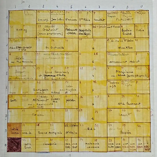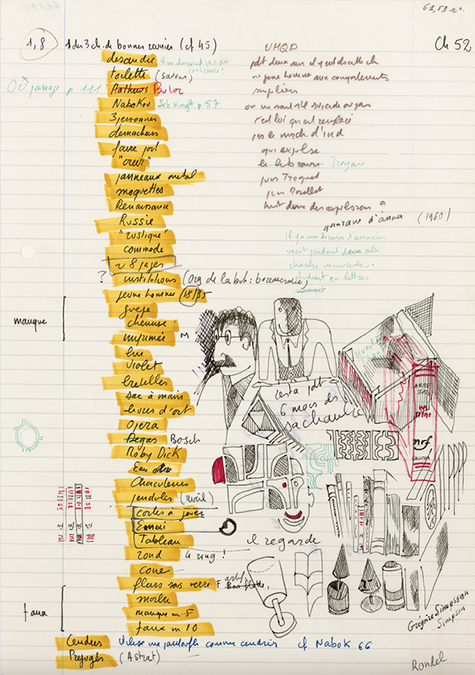 On se souvient de la dilection de Perec pour l’écriture à contraintes : le roman La Disparition (1969) écrit sans la voyelle e ; Les Revenentes (1972) écrit avec pour seule voyelle le e ; La Vie mode d’emploi (1978) dont les premières traces du projet sont de 1967 – contemporaines de l’écriture de La Machine – et représentant sans doute le chef-d’œuvre de Perec : un roman constitués de romans, dont l’écriture ressortit à une machinerie complexe (plan de l’immeuble, succession de chapitres obéissant aux déplacements du cavalier sur un damier, modèle du bi-carré orthogonal d’ordre 10, etc.). Ces grilles que Perec interpose entre le texte et nous sont celles qui permettent la distanciation d’avec la réalité, et c’est cette distance qui permet au lecteur attentif de distinguer les objets du texte perecquien, à savoir la réalité sociologique et autobiographique d’une part, les dimensions formelle et romanesque d’autre part ; ou encore, et plus schématiquement : l’écriture et la réalité.