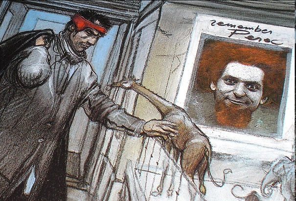 « Là-haut, dans le traceur, il y a les rouages qui déterminent le mouvement de la herse, et ces rouages sont réglés en fonction du dessin réalisé à partir de la sentence. » […] Le voyageur aurait aimé dire quelque chose d’agréable, mais il ne voyait que des lignes labyrinthiques qui se croisaient dans tous les sens et couvraient toute la surface du papier, au point qu’on ne distinguait qu’avec peine des espaces blancs.