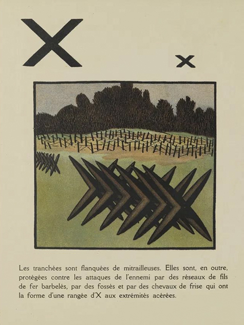 Un vieil homme aux moustaches grises [qui] sciait son bois sur un chevalet formé de deux croix parallèles, prenant appui sur l’extrémité de leurs deux montants de manière à former cette figure en X que l’on appelle « Croix de Saint-André », et réunies par une traverse perpendiculaire, l’ensemble s’appelant, tout bonnement, un X. Mon souvenir n’est pas souvenir de la scène, mais souvenir du mot, seul souvenir de cette lettre devenue mot, de ce substantif unique dans la langue à n’avoir qu’une lettre unique, unique aussi en ceci qu’il est le seul à avoir la forme de ce qu’il désigne.