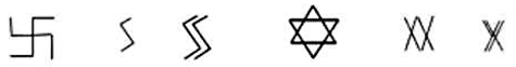 Point de départ enfin d’une géométrie fantasmatique dont le V dédoublé constitue la figure de base et dont les enchevêtrements multiples tracent les symboles majeurs de l’histoire de mon enfance : deux V accolés par leur pointe dessinent un X ; en prolongeant les branches du X par des segments égaux et perpendiculaires, on obtient une croix gammée […] elle-même facilement décomposable par une rotation de 90° d’un des segments en S sur son coude inférieur en sigle SS ; la superposition de deux V tête-bêche aboutit à une figure [..] dont il suffit de réunir horizontalement les branches pour obtenir une étoile juive […]. C’est dans la même perspective que je me rappelle avoir été frappé par le fait que Charlie Chaplin, dans Le Dictateur, a remplacé la croix gammée par une figure identique (au point de vue de ses segments) affectant la forme de deux X entrecroisés […]