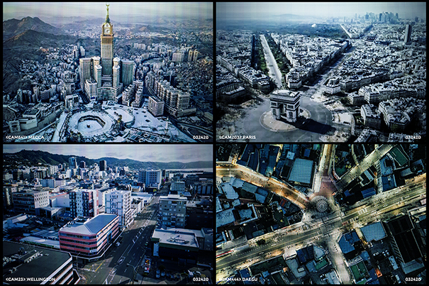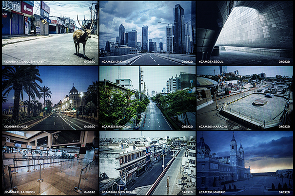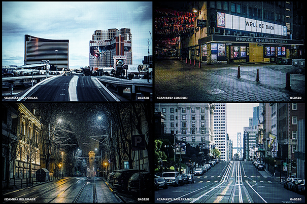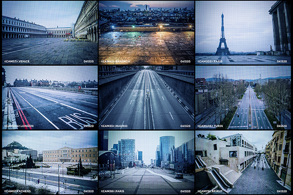 Avant l’arrêt brutal de toute activité provoqué par le surgissement de la Covid-19, j’avais démarré un projet pour une entreprise internationale leader dans la protection et la sécurité. Celle-ci souhaitait mettre en valeur son système de vidéosurveillance et son réseau hyperconnecté. Pour réaliser cette campagne promotionnelle, j’avais donc accès à des milliers de captations issues de ses appareils de télésurveillance répartis dans d’importantes villes à travers le monde où la société est implantée. Or, dès le début de l’année 2020, je recevais quotidiennement, non plus des captations de capitales grouillantes et de rues saturées de populations, mais des images presque irréelles : l’humain y avait totalement disparu, les rues étaient dépeuplées, les sites touristiques désertés, les territoires abandonnés, les villes devenues fantômes. S’il avait été encore de ce monde, l’historien de l’art Daniel Arasse se serait exclamé : « On n’y voit rien » ! Effectivement, on ne voyait plus rien de ce que ces images nous montraient vraiment. J’en étais sidérée. Et évidemment effrayée. Je me demandais même si ce que je voyais n’était pas des images fabriquées de toutes pièces, des images de science-fiction, et cela avant même les images génératives produites par l’IA qui ne sont apparues que deux ans plus tard. Le flux continu des images que je recevais du confinement mondial provoquait chez moi une posture ambivalente où la peur et la fascination s’entremêlaient. De même, j’étais confrontée à toutes sortes de questions sur les dérives sécuritaires de la pandémie ainsi qu’à la violence faite à l’humanité, suspendue et enfermée dans une sorte de grand « camp » organisé à ciel fermé. Et, pour la première fois, globalisé. Cependant, à compter du jour où j’ai obtenu l’autorisation d’exploiter certaines de ces archives pour élaborer une série plus personnelle propre à mon travail artistique, mon agitation s’est paradoxalement transformée en une dynamique d’observation vivante, en un laboratoire de création. Cette crise inédite, je l’ai donc considérée frontalement, à la manière dont Friedrich Nietzsche nous enjoint de toujours considérer la tragédie des événements comme la véritable « centre-matrice de l’art ». C’est ainsi qu’est née cette série intitulée 2020 : A Viral Odyssey, ainsi qu’une autre série photographique parallèle, Pandemoniopolis qui lui répond.
