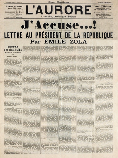 3 – Tu convoques aussi Émile Zola et son « J’accuse ! » (1898) au cours de l’affaire Dreyfus, amenant Genevièy à son tour à accuser : elle porte ainsi « plainte contre X / en attendant que les chiens de faïence s’animent / je suis là / avec ma liste en X / et j’accuse ». Qu’est-ce qui t’a amené à utiliser le modèle de cette « lettre ouverte », et pourquoi celle-ci te paraît-elle pertinente comme forme d’engagement littéraire ? En quoi la rhétorique déployée dans cette lettre de Zola te paraît-elle toujours efficiente? Estimes-tu qu’une telle lettre est la forme idéale pour faire « prendre conscience » aux lecteurs ?